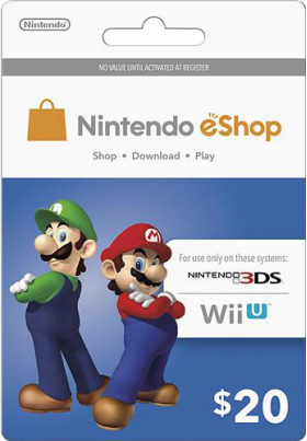 Предоплаченная карта, позволяющая пополнить счет на $20 долларов для американской версии аккаунта Nintendo eShop. Данная карта позволяeт приобретать дополнительные игры, услуги или игровой контент в любой точке мира. Для этого достаточно подключить консоль к сети интернет и войти на Nintendo eShop.