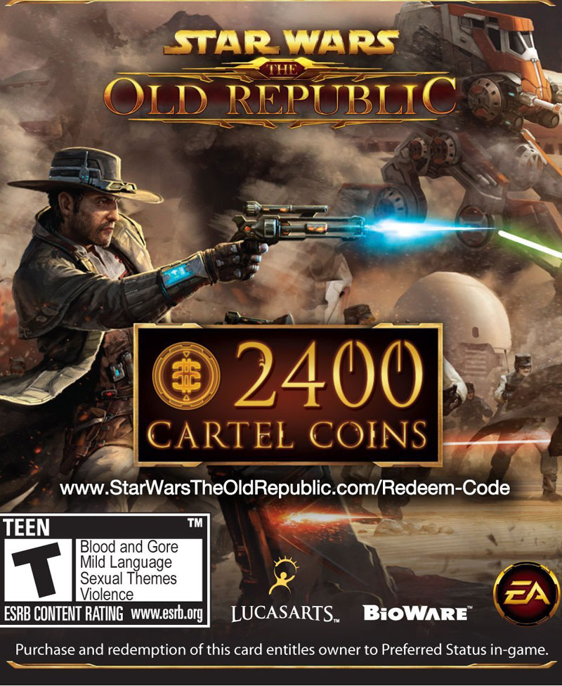 Данная карта содержит специальный код, позволяющий пополнить ваш внутриигровой кошелек на 2400 монет Картеляв игре Star Wars: The Old Republic. Монеты Картеля позволяют приобрести различные предметы и паки во внутриигровом магазине игры.